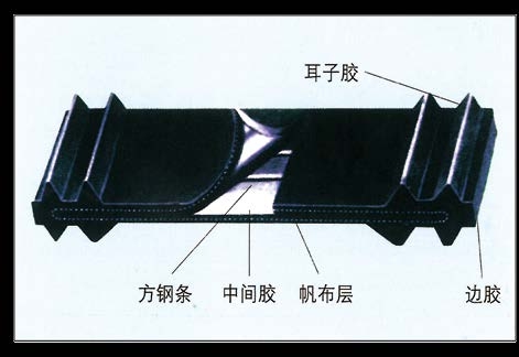 分为:普通钢丝绳牵引输送带、阻燃钢丝绳牵引输送带。 沿胶带横向铺设方钢条,其间以橡胶填充,用胶布包覆成为带芯并 覆盖上、下覆盖层,在由此构成的带体两边设置耳胶、边胶。