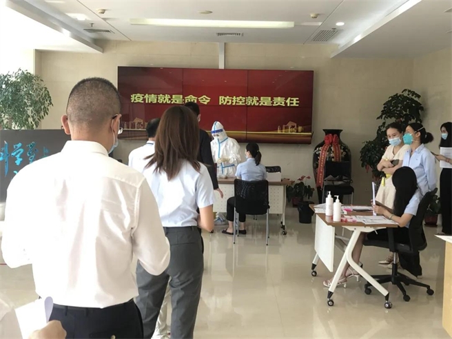 图为中化福建石油纪检干部深入一线监督员工开展核酸检测