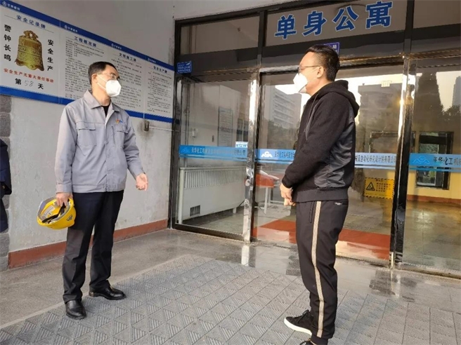 图为装备公司天华院纪检干部深入公司单身公寓检查防疫措施落实情况