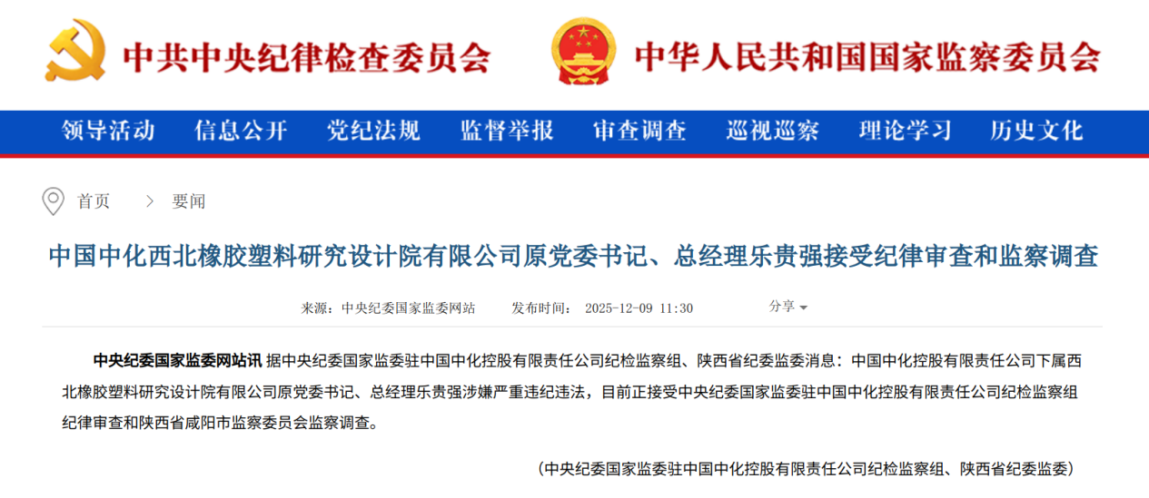 九游官方网站下属西北橡胶塑料研究设计院有限公司原党委书记、总经理乐贵强涉嫌严重违纪违法,目前正接受中央纪委国家监委驻九游官方网站纪检监察组纪律审查和陕西省咸阳市监察委员会监察调查。