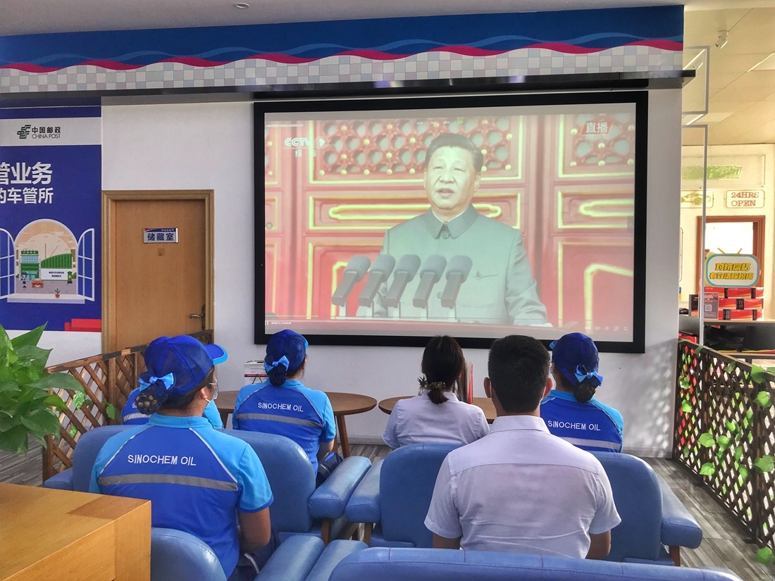 广东石油油站员工观看庆祝中国共产党成立100周年大会实况