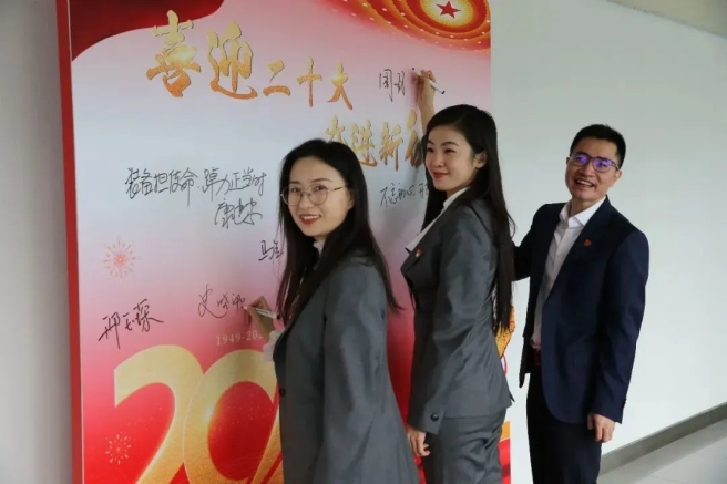 二是“移动课堂”,及时将党的二十大报告主题展板在公司宣传栏上展出,在公司过道及办公区展示党的二十大金句主题海报,并在公司公共区域屏幕上滚动播放会议精神宣贯视频,确保会议精神入眼入脑入心。