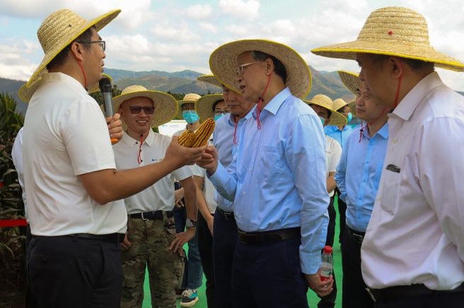 李凡荣走进先正达集团中国南繁玉米育种基地试验田,与育种科研人员深入交流,了解基地建设、育种科研创新成果、商业转化等方面进展。他仔细询问一线育种科研人员的工作和生活情况,对大家长期坚守一线辛勤付出表示感谢。