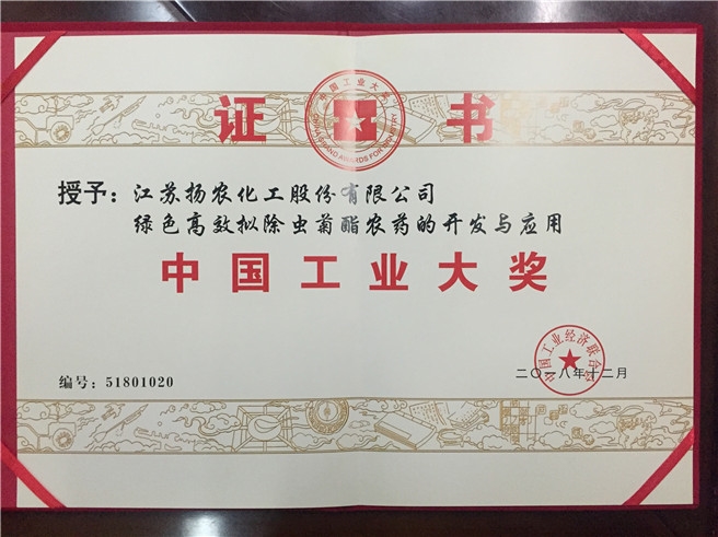 12月9日,第五届中国工业大奖发布会在北京人民大会堂举行,中化集团化工事业部下属扬农股份“绿色高效拟除虫菊酯”项目摘得我国工业领域最高奖项“中国工业大奖”。 中国工业大奖由国务院批准设立,每两年评选一次,评选宗旨为代表我国工业化方向、道路和精神。全国人大原副委员长顾秀莲,中国工业经济联合会会长李毅中出席此次大会并颁奖,共授予12家企业、11个项目“中国工业大奖”,授予20家企业、16个项目“中国工业大奖表彰奖”;授予14家企业、10个项目“中国工业大奖提名奖”。 扬农股份是国内最早从事菊酯研究的企业,依靠自主创新先后开发菊酯新品50多个,填补国内外空白20项,申报发明专利182个,制定菊酯类标准9项,成功打破跨国公司在中国市场20多年的垄断,产品占有国内70%以上市场份额,并返销欧美、日本等发达国家市场。扬农股份所生产的菊酯于2017年被工信部认定为全国制造业单项冠军产品。 |