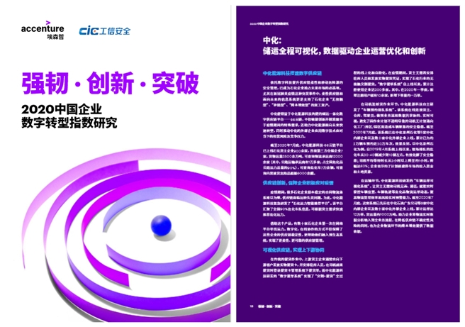 日前,中化能源科技有限公司在石化行业数字供应链领域的经营案例,作为“中国数字化转型领军者企业创新案例”入选《2020中国企业数字转型指数报告》。该报告在工信部指导下,由国家工业信息安全发展研究中心联合埃森哲中国发布。 埃森哲中国与国家工业信息安全发展研究中心联合进行的中国企业数字转型指数调研,至今已持续三年。调研发现的问题、总结的经验,得到政府、企业、合作伙伴的广泛认可与关注。今年的报告通过对化工、物流等九大行业的近400家中国企业,进行疫情前、疫情后两次数据采集和问卷调查分析,旨在围绕我国企业数字转型进程,重点探究新冠肺炎疫情带来的数字化加速效应和长期影响。