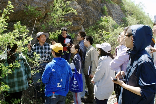 5月10-11日,中化集团下属中化石油勘探开发有限公司(简称中化勘探开发公司)组织花岗岩野外地质考察,公司各项目管理部、技术研究中心和规划计划部共20名员工,赴北京房山周口店地区作了实地考察。 本次考察由中国地质大学(北京)颜单平、赵国春两位教授带队,从岩体原生流动构造、原生冷却节理、韧性变形带和后期脆性改造四个层面,对野外花岗岩体的节理(裂缝)的构造识别进行重点观察。公司项目管理人员结合也门项目基岩油藏开发现状,针对裂缝油藏开发的世界性难题,与两位老师展开了深入讨论。大家根据野外节理(裂缝)的实际观测情况各抒己见,力求将裂缝的形成机理和预测应用于生产实践。