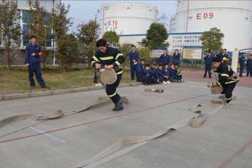 一年一度的“119”消防日来临之际,11月7日,中化集团下属中化扬州石化码头仓储有限公司(简称“中化扬州”)举办了消防运动会,以持续提升员工消防安全技能,凸显“人人参与消防、共创平安和谐”这一主题。相比往年,今年活动员工参与面更广,竞赛项目也有了新变化,除了以往一些消防技能、实战灭火等常规项目外,今年还新增了知识竞赛项目,给整个运动会增添了更多精彩。共有68人次参与了男、女两个组别共5个项目的比赛。 消防知识竞赛首先“开战”,各参赛队员注意力高度集中,反应神速,对答如流,比分始终咬合僵持;场下观众替场上选手捏把汗的同时,也被问答回合之间的消防知识所吸引,增长了见识。
