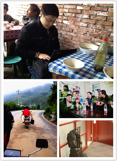 上图:建设系统事业部的小刘在西北某个极其偏远的“旮旯”地儿成功签下1个亿的项目,给自己的犒赏就是路边小吃摊的一大碗面,餐厅是一个没有屋顶的工棚,大冬天寒风呼啸,偌大的海碗被他吃得个底朝天。 左下图:山在高处,村在半壁,路在山腰,医疗系统事业部的阿金坐着摩的去拜访客户,清晨西南山野风光再加上一股不达目的誓不罢休的劲头,这才是真正的“高大上”的金融俊才范儿。 右小图-上:寒风中,项目经理们与客户彼此扶携、共攀高峰,用一碗泡面加一瓶清水表示庆祝,谈笑间展望美好的合作发展前景。 右小图-下:“远东学院”的课堂里,大家正在专心听讲学习,背包与行装在教室一隅守候,原来有员工参加完培训就要赶到外地出差,在远东宏信,合格的前线员工必定是一位虚心求教的好学生、一名冲锋陷阵的好士兵。 |