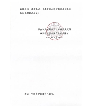 近日,国务院应对新型冠状病毒肺炎疫情联防联控机制医疗物资保障组、湖北省新型冠状病毒感染肺炎疫情防控指挥部和湖北省慈善总会分别向中化集团发来感谢信,向公司捐款捐物的举措、为各地疫情防控工作所作贡献致以感谢。国务院及湖北省有关部门给予中化集团的高度肯定离不开广大中化员工的辛勤付出,中化人将再接再厉用行动承担央企责任,为国家疫情防控持续贡献中化力量!