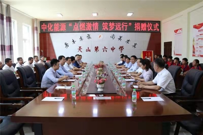 随后,江正洪一行前往天山六中,与阿旗教育局和学校有关负责人就中化能源对天山六中的帮扶工作开展座谈。江正洪代表中化能源向天山六中捐赠60万元用于教师成长和校园建设项目。中化能源自2016年起对天山六中学生进行资助,并成立“中化能源班”开展精准帮扶。