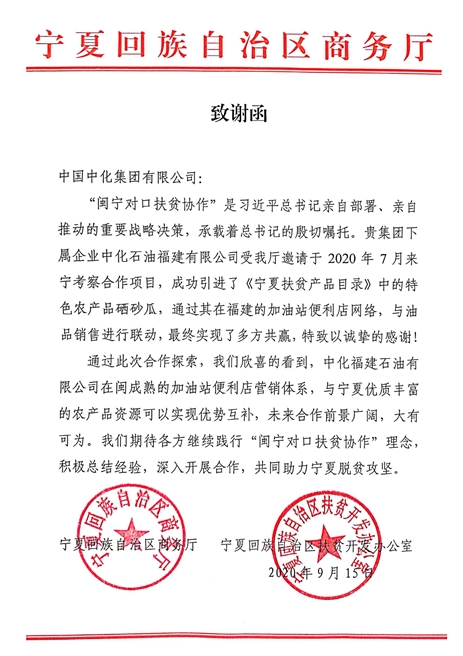 9月15日,宁夏回族自治区商务厅、宁夏回族自治区扶贫开发办公室向中化集团发来致谢函,充分肯定中化石油销售公司下属福建石油公司为当地脱贫攻坚所作努力,并致以诚挚感谢。 致谢函中写道,“闽宁对口扶贫协作”是习近平总书记亲自部署、亲自推动的重要战略决策,承载着总书记的殷切嘱托。中化石油福建有限公司受邀于2020年7月来宁考察合作项目,成功引进了《宁夏扶贫产品目录》中的特色农产品硒砂瓜,通过其在福建的加油站便利店网络,与油品销售进行联动,最终实现了多方共赢,特致以诚挚的感谢!”
