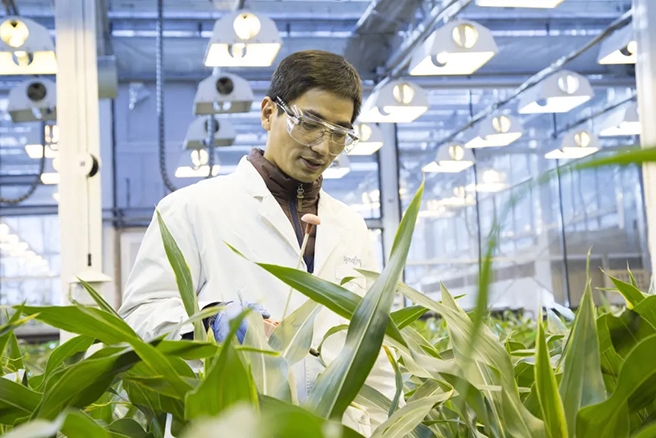 图为先正达集团中国种子科研人员在温室大棚中选育良种