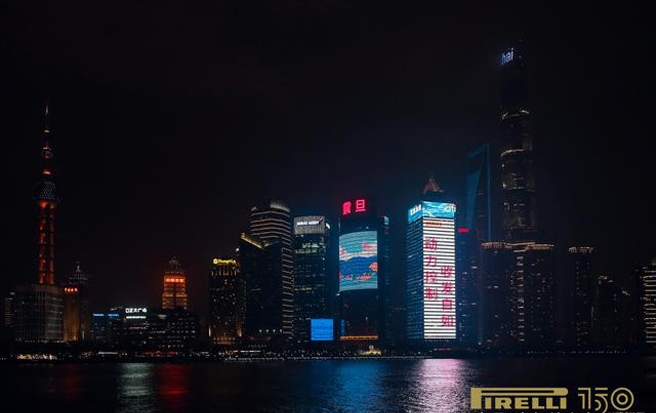华灯初上,黄浦江两岸流光溢彩。在夜色与光影交织下,倍耐力LOGO和标识点亮上海外滩,璀璨夺目。
