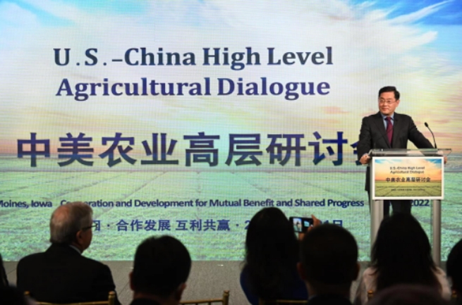 秦刚在中美农业高层研讨会上发表主旨演讲时表示,此次走进美国的腹地,是一次“心之旅”,推动和睦与信任,同时也是促进中美农业农村合作。中国是最大的农产品进口国,美国是最大的农产品出口国,中国人民对美好生活的需求与美国优质农产品供应和先进农业技术相遇,为中美农业合作打开了空间。从战略角度推动中美农业互利合作,既有利于丰富中国老百姓的“粮袋子”,增加美国农民的“钱袋子”,也有利于减少全球粮食供应的不稳定性和不确定性,同时有利于全球应对气候变化的努力。 秦刚强调,中美作为农业大国和农产品贸易大国,应携手应对挑战,保持农业稳定发展,增强农产品供应链韧性,保障本国粮食安全,并积极促进国际粮食安全合作,必将有利于维护世界和平、促进全球经济发展和社会稳定,推动人类可持续发展。 傅文德出席会议并表示,中国人民十分热情淳朴,和美国人民有很多相似之处,两国需要更多交流机会了解彼此。全球粮食安全现在已从一个“议题”发展成为亟需解决的挑战。中美合作有助于解决这一难题。
