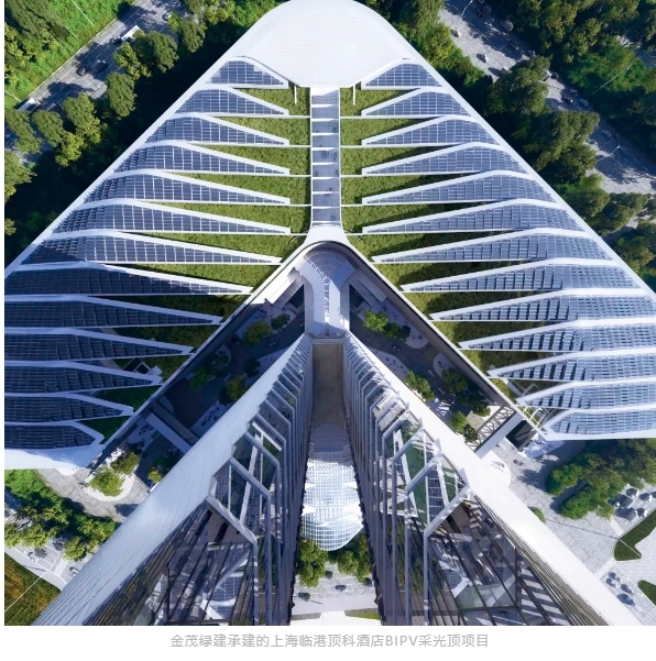针对行业和市场痛点,金茂绿建“羲和光聚”轻质光伏组件产品不仅降低了组件重量,还能抗击打。此外,该产品还能满足更多特殊场景设计需求,让每一寸屋顶安装光伏成为可能。 够轻盈:采用自主创新的封装材料替代玻璃。组件重量相比传统玻璃组件减重70%,完美匹配各种屋顶的承重要求。 更耐造:摒弃钢化玻璃材料,采用无机材料增强主体材料的抗冲击结构设计,避免自爆风险,使产品达到冰雹冲击无隐裂的标准。 更简捷:安装过程简单易操作,无需穿透屋顶。采用耐受能力强的结构胶,将组件与屋面粘接即可完成安装,相对于常规组件,可节约安装成本50%。 更高效:受“荷叶效应”启发,轻质组件外层采用氟材料,有效防止积灰积雪,更利于提升系统发电量,使组件日常运维更高效。此外,安装轻质组件可起到保温隔热的效果,提升建筑寿命。 ✦应用场景✦金茂绿建轻质光伏组件产品可应用于建筑、公路交通、海洋船舶、汽车、能源电站、消费电子产品等多领域。 光伏建筑一体化组件 让建筑与光伏完美结合 光伏建筑一体化(BIPV)是指光伏与建筑的一体化技术,用太阳能电池板取代建筑物外表的一些结构,如屋面、建筑立面、遮雨棚等。通过光伏发电组件提供电力,以供建筑物能源使用。