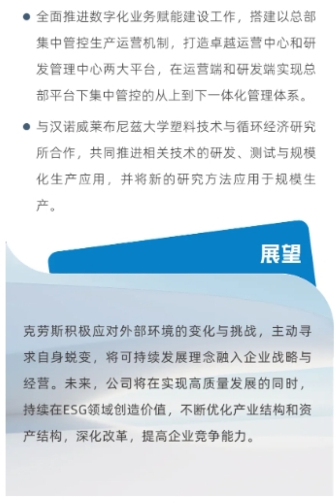 目前,E(Environmental环境)S(Social 社会)G(Governance 治理)逐渐成为企业高质量可持续发展的重要衡量指标。中国中化坚定履行企业公民责任贯彻落实新发展理念,坚持绿色发展、循环发展、低碳发展,建立完善的环境、社会责任和公司治理体系。近日,中国中化旗下克劳斯玛菲发布2023年ESG报告。