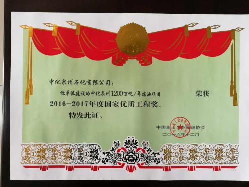 12月5日,中国施工企业管理协会发布《关于公布2016-2017年度第一批国家优质工程奖工程名单的公告》(中施企协字[2016]65号),中化泉州1200万吨/年炼油项目获评国家优质工程奖。 2014年11月5日,公司完成《中化泉州1200万吨/年炼油项目申报国家优质工程奖策划方案》编写,并启动国家优质工程奖申报工作。2016年1月13日-14日,申报国优现场评估会召开,中国化工施工企业协会专家进行了现场检查评估;2016年8月12日-13日,国优专家复查组经过现场复查认为:中化泉州1200万吨/年炼油项目建设质量为大型石化领域的精品工程,工程整体符合国家优质工程奖标准,同意推荐参评国家优质工程奖。