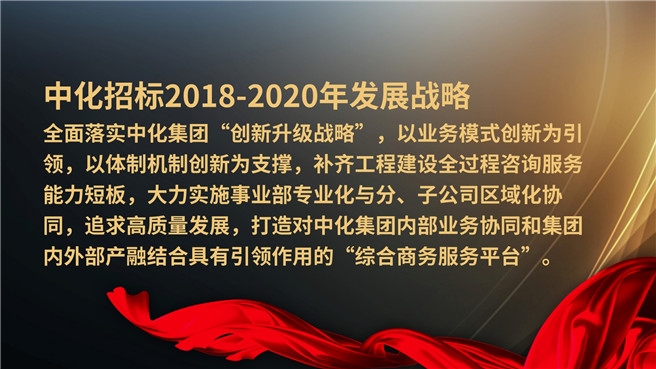 12月28日,中化招标成立20周年暨新战略发布会在北京举行。中化集团董事长宁高宁,集团党组副书记、副总裁李庆,总会计师杨林,副总裁江正洪,董事会秘书李强,战略执行部副总监王红军等公司领导,以及中国商飞集团总经理助理郭博智、国家图书馆副馆长孙一钢等60余家客户单位代表出席发布会。 发布会揭晓了中化招标2018-2020年战略愿景和发展战略,即公司要由“小而美”变得“大而强”,中化招标将围绕工程建设全过程咨询服务能力、专业化和区域化发展、业务模式创新、体制机制创新、高质量发展、综合商务服务平台等重点内容的内涵和推进实施路径,并期待最终实现“为客户创造价值,为社会培育英才”的价值使命。