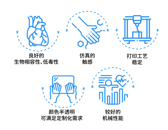 蓝星埃肯在3D打印有机硅材料领域具有丰富经验,其为3D打印量身定制的AMSIL™系列材料已经用于单喷头和双喷头挤出3D打印机上,比如:★适用于单组分材料的AMSIL™ 20 100系列、多组分材料的AMSIL™ 20 500系列,含为汽车、设备、电子等各种行业设计的产品配方;★AMSIL™ SILBIONE™ 系列,可结合3D打印帮助医护人员提供个性化治疗方案。其中,AMSIL™ SILBIONE™ 24503具有仿真皮肤的触感和柔软度,且耐受细菌、耐消毒。 近期,蓝星埃肯新推出两款3D打印有机硅弹性体AMSil™ 20503系列和AMSil™ 92102系列。 AMSil™ 20503系列提升了生产效率、延长了产品保质期,具备高理化性能和耐用性,适用于制作解剖模型和纺织品等部件。AMSil™ 92102系列可实现更精细的3D打印表面效果,能高效打印复杂材料结构。 该材料具备以下性能: