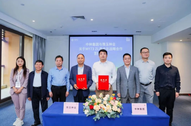 中种集团此次发布的新品牌,旨在整合旗下多项先进生物育种技术,为行业提供更系统、更高效的解决方案。依托品牌背后的研发实力,新品牌所覆盖的产品和性状可有效提升作物产量,减少化学农药使用,帮助种植者降低种植成本。 优质性状共享 玉米单产提升示范 为进一步汇聚双方优势资源,向市场提供优良性状、高产、适应性强的玉米品种,在此次论坛上,中种集团与河南省豫玉种业股份有限公司(以下简称“豫玉种业”)举行战略合作签约仪式。