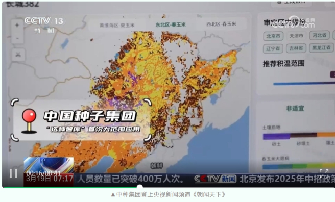 3月初,在安徽阜南县,128万亩小麦陆续进入返青拔节期,中化农业MAP阜南中心引入多光谱无人机,助力农户做好春耕春管工作。这款搭载多光谱相机的无人机能够快速生成小麦植被指数地图,为精准施肥提供科学依据。“一架次起飞大概20多分钟,针对1000多亩地做精准巡田,做成处方图,长得旺的地方少施点,长得差的多施点,变量施肥使整片小麦的长势也更平衡。”中化农业MAP阜南中心经理黄岩解释道。 媒体聚焦 破解选种难题 赋能精准播种 央视新闻频道《朝闻天下》 面对气候多变和土壤差异带来的选种难题,中种集团创新研发的“玉米品种晋级与精准定位决策系统”提供了智能解决方案,并于3月19日受到央视新闻频道《朝闻天下》关注。这是国内首个集成多维数据的玉米精准定位平台,能够整合多源数据,快速识别适宜种植区域,帮助农户在春耕阶段提前选好种、选对种。