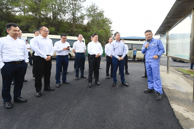 9月29日下午,宁高宁一行前往郴州基地矿山分厂调研,实地考察矿山可持续发展情况。站在亚洲最大的整装萤石矿——界牌岭多金属矿的采矿场边,宁高宁详细询问了萤石及深部金属矿开采情况,欣喜于矿山五年来的变化,对团队工作表示高度认可。 近十年来,郴州基地围绕矿山资源高效开发,在采矿和选矿方面开展大量基础研究工作和技术攻关,成功打通从“难选矿”到高附加值氟化工产品的关键瓶颈,并将生产过程中产生的废石、废渣、废水进行综合利用,创造性地绘就一张以绿色矿山为核心的循环经济发展蓝图。