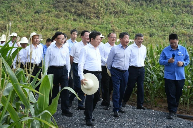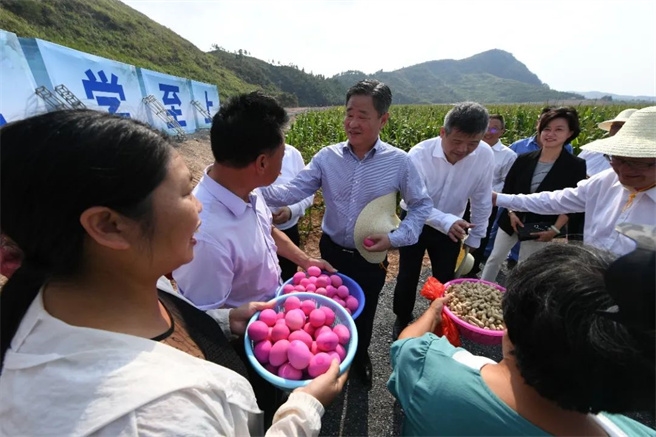当前正值丰收季节,示范基地种满了玉米、西瓜和辣椒等经济作物,一片生机盎然。宁高宁一行走入田间,观看农作物长势,听取示范基地未来规划介绍。当地村民专程送来红鸡蛋和花生,感谢中国中化给塘头坳带来的变化。