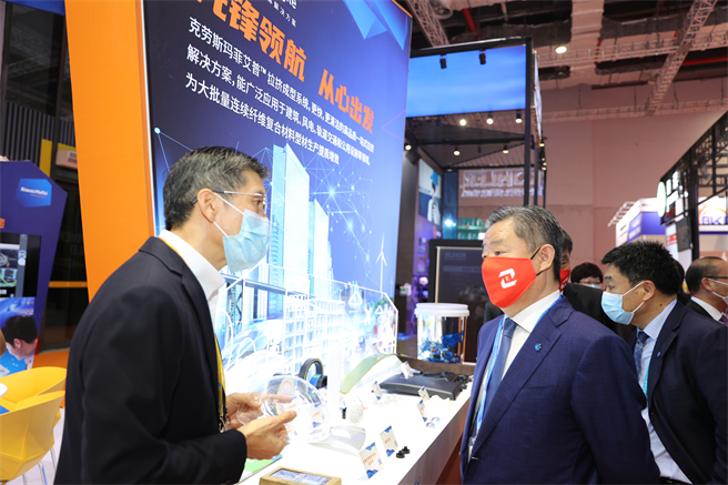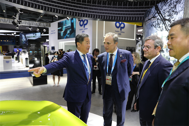 点击图片观看视频:宁高宁全英文推介中国中化旗下海外企业产品和技术 11月5日,在第四届中国国际进口博览会(简称进博会)举办期间,中国中化董事长宁高宁带队到公司旗下法国埃肯有机硅、德国克劳斯玛菲、法国安迪苏和意大利倍耐力的进博会展台巡馆,并先后到访霍尼韦尔、陶氏化学、施耐德电气等合作伙伴的展区参观,与参展商代表深入交流。 巡馆期间,宁高宁亲自出镜,率有关团队负责人开启“带货”模式,全英文向全球受众推介中国市场以及上述4家中国中化旗下海外企业的先进产品和绿色科技。