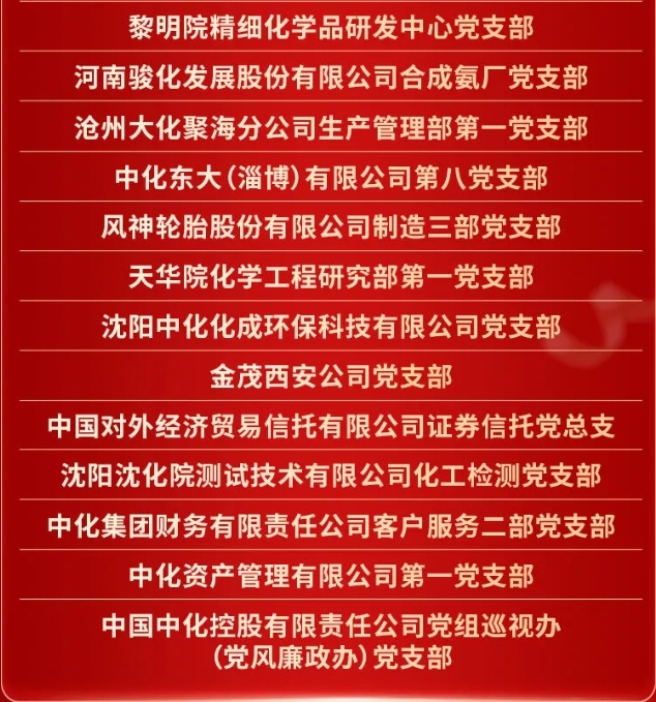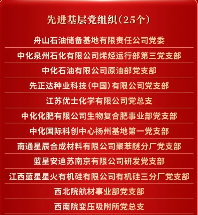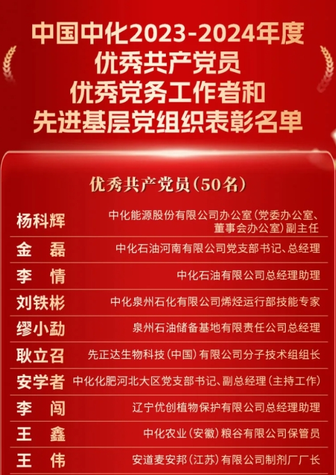 2024年6月27日,国务院国资委党委召开中央企业“两优一先”表彰大会,决定对中央企业优秀共产党员、优秀党务工作者和先进基层党组织进行表彰,激励中央企业各级党组织和广大共产党员在全面推动国资央企高质量发展的新征程中创先争优、建功立业。中国中化共有5个先进集体和个人荣获中央企业“两优一先”荣誉称号。 2023年以来,中国中化各级党组织和广大共产党员坚持以习近平新时代中国特色社会主义思想为指导,全面贯彻落实党的二十大精神,深入开展学习贯彻习近平新时代中国特色社会主义思想主题教育,聚焦公司改革发展和党的建设,在科技创新、提质增效、扭亏治困、合规经营、安全生产、重大项目建设等重点任务中,充分发挥党组织战斗堡垒作用和党员先锋模范作用,涌现出一大批先进典型。中国中化党组决定对公司100个先进集体和个人进行表彰,授予中国中化“两优一先”荣誉称号。