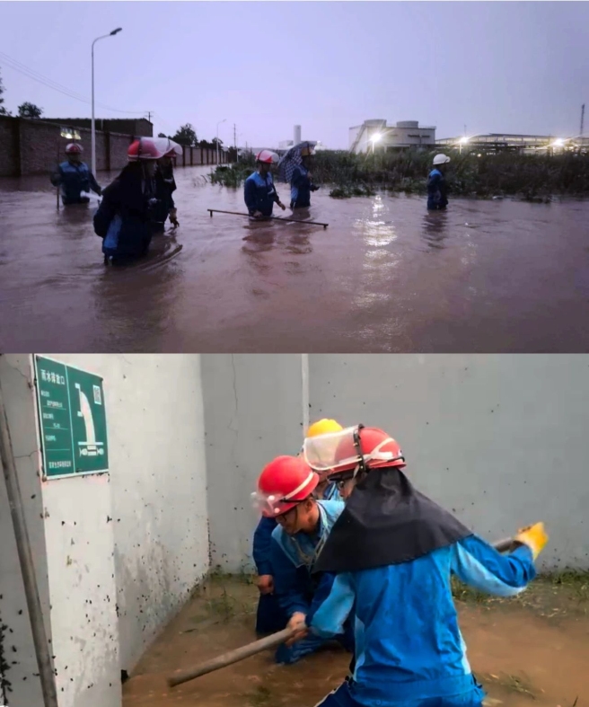 图片应急抢险组在积水最为严重的区域疏通雨水排放口 沈阳化工 7月26日,沈阳化工停电检修首日遇历史最大降雨,道路积水严重,车辆通行困难,人员到岗困难。生产管理部协同各分厂及时调配人员,切换检修方案,开展室内检修,保障了检修工作进度。