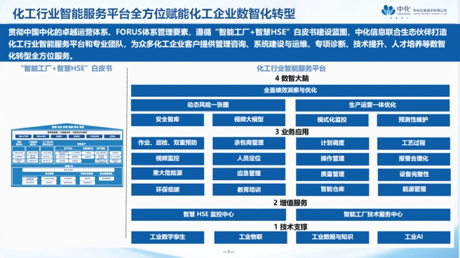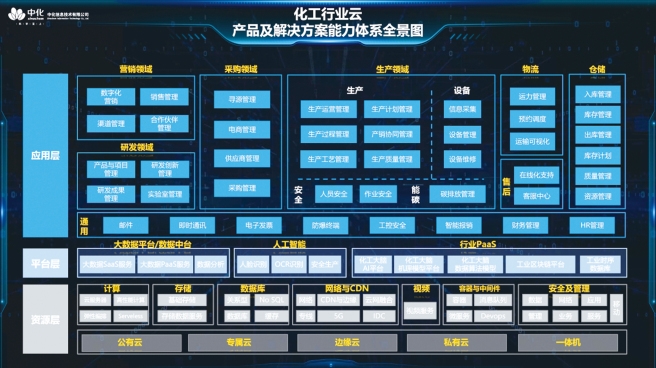中化信息:三大数字化解决方案智领化工行业未来 本次展会上,中化信息重点展示化工行业云、化工智能服务平台、人工智能+数字化工等最新创新成果及行业应用实践。 化工行业云:“化工行业云”是国务院国资委遴选批复的化工领域唯一的垂直行业工业云平台,致力于打造符合行业特色需求的“小型化、快速化、轻量化、精准化”的云上产品和解决方案,提供低价优质的云资源服务,助力推动数字科技与化工产业深度融合。 化工行业智能服务平台:化工行业智能服务平台可为众多化工企业客户提供管理咨询、系统建设与运维、专项诊断、技术提升、人才培养等数智化转型全方位服务。中化信息所属蓝星智云针对化工生产的特点,从工艺分析入手,全方位覆盖化工企业生产过程的感知、分析、安全、控制、优化及培训等领域。目前,化工行业智能服务平台已全面服务支撑中国中化“智能工厂+智慧HSE”建设应用,并向行业输出推广。 人工智能+数字化工:中化信息专注挖掘人工智能技术与化工业务领域的最佳切入点,着力推动业务系统提质增效与技术创新,打造全面覆盖集团各企业级业务应用的“AI+”能力体系,形成集智答、智数、智匠、智链、智造、智研为一体的创新应用场景。