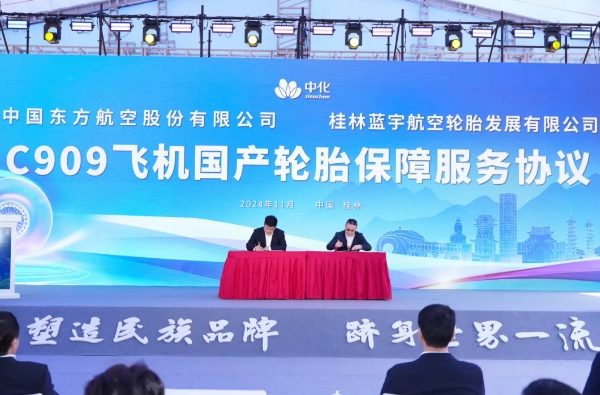 中国中化所属桂林蓝宇与东方航空、桂林航空和瑞丽航空分别就C909、A320及B737NG航空轮胎使用签署产品应用协议 在会议现场,中国中化分别与中国商飞、南方航空签署战略合作协议,聚焦大飞机产业链建设、化工新材料研发、航空轮胎应用、运输服务和绿色发展等领域不断深化合作。中国中化所属桂林蓝宇与东方航空、桂林航空和瑞丽航空分别就C909、A320及B737NG航空轮胎使用签署产品应用协议。