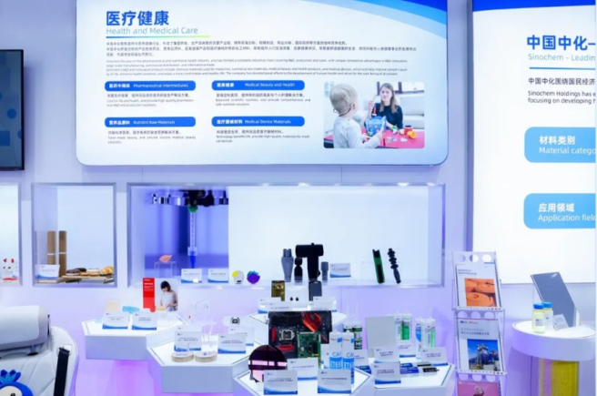 亮点2:精益制造 满足人们对美好生活的向往 作为国内规模领先的化工新材料生产企业,中国中化化工新材料覆盖有机氟材料、有机硅材料、工程塑料、高性能纤维、电子信息材料、锂电池材料、高端聚烯烃、聚氨酯材料、碳一精细化工材料等多个领域,为满足人民对美好生活的向往奠定坚实材料基础。 医药与营养健康 在医药与营养健康领域,中国中化聚焦药品、营养品原料、医美健康产品和医疗器械等产业方向,形成覆盖研发、生产及销售的完整产业链。展会现场展出具备良好生物相容性、安全性和环保性的可穿戴设备与皮肤接触产品、护理产品、医疗器械等高性能医疗级材料解决方案,如3D打印有机硅心脏模型、疤痕护理软膏等,帮助人们提高健康水平。