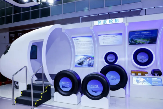 亮点1:以新提质 配套民用航空产业链 在先进制造链展区,中国中化携多款民用航空轮胎亮相展台。其中,首条装配空客A320飞机的国产子午线轮胎刚刚于11月21日试飞成功,吸引众多参观者驻足。 民用航空轮胎 民用航空轮胎是民用航空产业链上的关键配套部件,关乎飞机起降安全。中国中化基于热力耦合构型优化、关键橡胶材料模量匹配优化等创新技术研发的高性能民航子午线轮胎,为民用航空产业链提供了坚实保障。目前,中国中化已具备为中国商飞、空客、波音多种机型提供轮胎的能力,研制的产品实现中国商飞、空客、波音三大主机厂主力机型全覆盖。