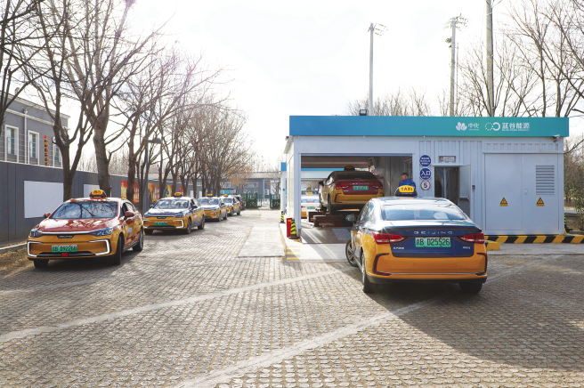 奥森北园换电站位于北京市朝阳区奥林匹克森林公园北园西门停车场内,其地理位置优越、交通条件便捷、换电环境舒适,对于北京出租车司机而言是日常换电的较好选择。 精诚合作 打造换电运营体系 2023年2月,中化新能源与北汽集团旗下蓝谷能源签订合作备忘录。双方依托各自优势,明确了在北京及其他重点城市开展经营性乘用车换电站运营、动力电池梯次利用等核心领域合作的发展方向。 签约以来,双方在选址开发、设备技术、平台操作、制度体系建立及HSE监督管理等多个领域进行深度交流,推动换电站项目顺利落地。2024年3月,双方试点合作的位于北京市顺义区津蒙大厦的联合换电站投入运营(以下简称“津蒙联合换电站”),目前已累计为广大出租车司机提供超过200万千瓦时的充电服务,获得广泛好评。“中化”牡丹花和“蓝谷能源”联合品牌形象逐渐被北京广大出租车司机所熟识。