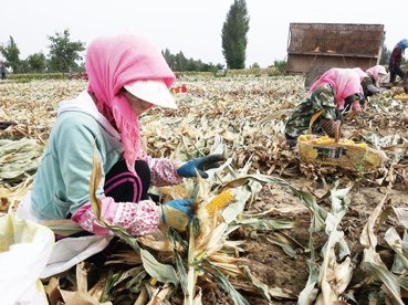 中化集团所属中种公司致力打造国家级玉米精品制种基地,图为甘肃张掖农民在流转土地上收玉米。