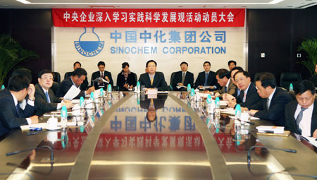 刘总指出,在全党开展深入学习实践科学发展观活动是党的十七大作出的战略决策,是用中国特色社会主义理论体系武装全党的重大举措,是“三个代表”重要思想学习教育活动和保持共产党员先进性教育活动的继续,是深入推进改革开放、推动经济社会又好又快发展、促进社会和谐稳定的迫切需要,是提高党的执政能力、保持发展党的先进性的必然要求,也是深化国有企业改革、发展壮大国有经济的迫切要求。作为国有重要骨干企业,中化集团要立足于全党全国工作大局,结合公司改革发展实际,深刻认识开展深入学习实践科学发展观活动的重大意义,有效应对国际金融危机,努力推动企业平稳、健康、持续发展,为国家经济社会发展作出应有贡献。
