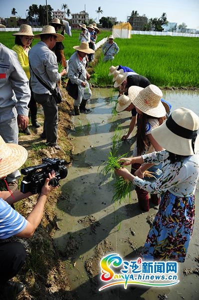 3月9日,网络名人在中种公司三亚育种基地体验插秧。(三亚新闻网记者沙晓峰摄)