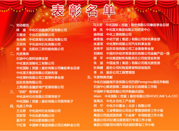 本次受表彰的单位和个人,是集团公司战略推进、管理改善等各个方面、各个群体中的先进代表。公司要求各单位结合“创先争优”活动,采取多种形式,大力宣传先进集体和个人的事迹,弘扬他们的精神,继续秉持“创造价值,追求卓越”的理念,坚定信心、扎实工作,实现中化事业发展新的突破。
