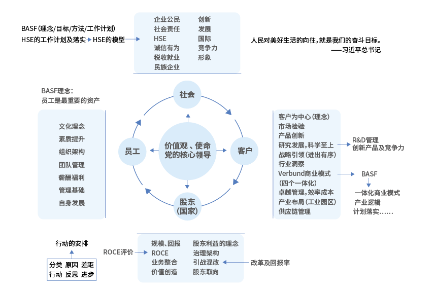 第二,客户。 客户就是市场,这是最终检验我们的一个关口、一个标准。这一关过不去,企业肯定要完蛋。先有观念,再说行为,客户这方面也是一样,我们要先树立一个理念,即“以客户为中心”。从这个理念出发,可以延伸出市场检验、产品创新、研究发展、科学至上、战略引领、行业洞察、一体化商业模式、卓越管理、效率成本、产业布局、供应链管理等多个方面。 其中,战略引领包含两个层面。第一个层面是公司资产组合战略,即进出有序、行业洞察,也就是不断调整资产组合,不断适应市场对行业的需求;第二个层面是企业竞争战略,比如说一体化,行业确定之后可以做一体化、降成本、做研发、做好产品,这些都是企业竞争战略。 关于一体化大家这两天讨论很多,巴斯夫的一体化战略就做得很好,路德维希几乎占了巴斯夫的一半,巴斯夫中国占巴斯夫全球的百分之十几,在中国他们要再建一个升级版的路德维希港,100亿美元预算,2026年要建成。一体化包括了产品、研发、市场、信息、资产组合一体化,具体来说,上游、下游怎么做,销售怎么做,研发怎么做,生产上下游、销售渠道、研发怎么联合,信息系统怎么联合等等,在这里面就有价值创造,协同效应也就出来了。 这次我们讨论比较多的是业务整合问题,业务整合绝对不是简单相加,一定是化学整合,不是物理整合,一定是发生了化学反应,产生有机联系,不是简单的相加,这是一个新的商业模式。 今天上午,金融和地产组也运用这些方法很好地分析了自身,逐步形成很多很好的管理方法。一法通,万法通。企业管理的方法都是相通的,真正领会把握了,去做其它行业也照样可以,逻辑是一样的。 关于产业布局,我们之前讨论产业园区的出发点往往是安全问题,觉得产业园区投资很大、不好管理。但通过讨论,我们越来越明确产业园区的确有一体化的技术逻辑、效率提高、战略创新在其中。未来,随着小型化工企业的逐步关停,安全管理水平高、产值高、技术水平高的化工园区将成为趋势。 今天的分析,为我们下一步怎么做带来了很好的理念和方法,等到明年这个时间再开会,我们会针对每一个点形成反思和行动。比如行业洞察怎么做?可能会把当时涉足的所有行业都列出来讨论,再去看这个行业我们还需不需要,是需要扩大或减少,以及要去投资什么新行业。 过去我们的投资有很多是相对被动的,别人想卖给你,你再去买,这叫投行驱动型的投资,投行做一个牵线搭桥的角色。至于这个资产是不是符合我们的战略、符合市场,发展趋势如何,这些就不一定了。这就是一个机会性的投资,我们试图把它搞成战略性投资。而下一步,我们将主动进行战略型投资,大方向确定了、行业确定了,我们主动找到他们去购买,或者自己干。 从客户本身来讲,MBA所教的大部分企业管理课程都在这儿了。但这里面也有我们对标巴斯夫着重提出来的几点,这里面可以根据重要性进行排序,并制定落实方法,做好这个模型后,以后每年过一遍,什么地方漏了,哪些还没做好,我们就心中有数了。 第三,股东。 股东,在管理课程里讲得比较少,大多不把它当成管理逻辑的一部分,但股东这点对我们来说很重要,因为国家、所有制的要求几乎决定了我们所有的行为。 作为国有企业,国家是大股东,当然也有小股东、合资股东。股东利益包括了规模、回报、ROCE(已动用资本回报率)、业务整合、治理架构、引战混改等诸多因素。我再次强调ROCE这个概念,它体现了占用的社会资源。特别是国有企业,几乎所有占用的钱都可以被认为是资本金。 必须把国家利益理念树立起来,我们就是放牛娃,这头牛是国家的,不是你的,你把牛放好了,你可以喝杯奶,但不能吃肉,你吃肉就要把牛杀了。要意识到企业不是个人的,当我们做的时间长了,企业做得比较成功了,很容易认为这个企业我说了算,不是这样的。不要说中国企业,国外企业也不是。必须首先把打工者的身份踏踏实实地定下来,可以试图改革这个体制,对打工者有更多的激励,从而使公司发展得更好一些,但是不可以违背、跨越、损坏这个规则。 就我们来说,第一要做好企业,提升ROCE,知道自己和巴斯夫的差距,知道一个好企业是有这个要求的;第二,希望通过引战、混改,让股东取向更市场化一些,但最终的目的还是要达到规模、回报率、ROCE这些目标。我一直讲,出资入评价里面,对与历史比的绝对数比较重视,实际上回报率是最重要的,我们自己必须清楚。 如果我们在同行业没有新的资本进入,如果回报率持续变低的话,有一天一定会完蛋,因为回报率高代表着创新投入和股东支持。头两年回报率低没事,如果每年都低几个百分点,别人做投入,而你没有,过几年就不行了。巴斯夫的财报就非常明确,它的回报率在不断提升,当然也有下降,比如它买了拜耳种子业务以后就下降了,因为买的比较贵被摊薄了,第一年业务也不太好,这个反过来讲是一个战略引领的东西,必须在很快的时间之内恢复好,这才叫成功。当然,这里面也有很多小循环,比如ROCE这个循环应该说清楚。 第四,员工。 这个模型虽然把员工放在最后,但是员工作为企业经营要素里一个非常根本的要素,几乎是企业效率管理过程中第一位的。一个企业如果能够让员工真正从心底认可理念、使命、战略、经营方式,对员工的评价出于公心,员工完全将企业利益和自身利益联