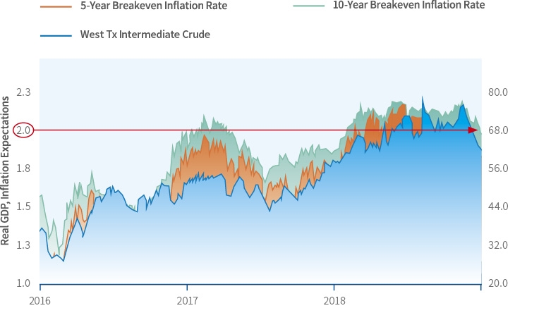 图1 (数据来源:美联储) 低油价真的好吗? 作为国际合作的中心商品,原油价格对世界经济的影响一直是一个颇具争议的话题。一般认为,高油价导致经济增速下降、引起通货膨胀等,历史上的数次石油危机都对世界经济产生了深远的负面影响。但反过来,低油价就真的好吗?毕竟从近几年世界经济走势来看,原油价格持续走低,世界经济形势并未因此好转,依然面临很大的下行风险。 以下论述皆以美国为例。图1对比了一项复合指标(综合利率、通货膨胀率和GDP三项指标)与WTI原油价格的相关性。从图中可以看出,油价波动趋势与经济走势有非常明显的正向相关性,油价的上涨/下跌与经济指标的上涨/下跌基本同步。 图2是美国5年和10年通胀率临界点和油价的对比。从图中也可以看出,油价波动与通货膨胀率的波动基本一致。核心通胀率超过2%的红线,一直是美联储加息的最重要心理关口。在2018年的大多数时间里,原油价格持续走高,美国5年和10年通胀率高于2%,就业和通胀持续向好,美联储对美国经济增长持乐观态度,先后4次加息。 换言之,在经济持续低迷、亟待刺激的现状下,油价上涨往往是石油需求增加、经济趋势向好的表现;反之,油价持续下跌则可能预示着经济提振乏力,甚至可能进入通货紧缩状态,而这是经济学家们最不愿看到的。对他们而言,通货紧缩比通货膨胀更加可怕,一旦经济进入通缩阶段,能够采取的有效调节手段少之又少。
