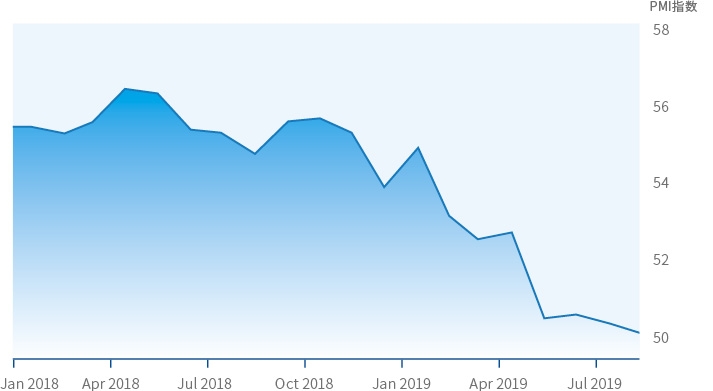 图3:WTI走势(来源:Trading Economics) 自我实现的寓言 因油价暴跌引发的对经济衰退或者通货紧缩的担忧,已引起部分国家和国际组织的关注。2018年12月3日,加拿大阿尔伯塔省宣布原油生产削减日均32.5万桶,此次减产计划的削减幅度超过石油输出国组织(OPEC)三个最小的成员国——赤道几内亚、加蓬和刚果共和国的总产量;12月7日,欧佩克会议结束,达成OPEC+减产120万桶/日的协议。 2019年,世界经济动能趋弱,油价亦是“跌跌不休”,背后反映了人们对经济衰退的担忧。人们对经济衰退的担忧影响原油价格走势,低位徘徊的原油价格再反过来进一步加深人们的担忧,这是一个典型的“自我实现”的寓言。 今年1-8月份,世界主要经济体美国和欧元区皆录得较低的通胀率。以美国为例,经济增长放缓,年初至今的通胀率皆低于2%,且与原油价格走势(WTI)基本契合(图3)。 低油价对美国经济的负面影响,正在逐渐显现。随着原油自高位下挫,美国制造业PMI亦持续下滑至荣枯线水平,经济增长活力随之减弱(图4)。 中国是原油进口大国,对外依存度很高。中国原油期货自2018年3月26日开市以来,价格走势与WTI和布伦特期货基本吻合。上海期货交易所数据显示,中国原油期货与布伦特期货的相关性高达93.1%。虽然在过往几次石油危机中,高企的石油价格没有给中国经济高速发展带来过多负面影响,但在当前严峻的国际形势下,我国经济面临的挑战和困难不言而喻。低油价伴随疲弱的经济形势,更需要提高风险意识,防范经营风险。