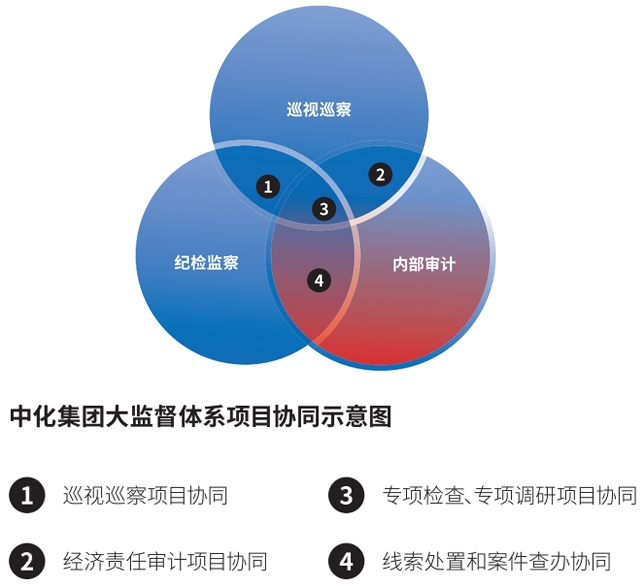 什么是大监督体系 《中化集团总部大监督体系(1.0)版》对大监督体系进行了阐释。概括而言,一是集团设立党组织、董事会、经理层,规范公司治理结构,建立健全权责对等、运转协调、有效制衡的决策执行监督机制,充分发挥党组织的领导作用、董事会的决策作用、经理层的经营管理作用;二是集团统筹巡视巡察、纪检监察、内部审计专责监督力量,建立监督工作会商机制,强化对党组织、董事会、经理层和领导人员廉洁从业、行使权力的监督,发挥监督合力,提高监督效能。 大监督体系建设遵循两个基本原则。一是坚持服务大局。围绕公司“科学至上,知行合一”价值理念,服务深化改革全面转型大局,把监督工作融入党的领导、党的建设和全面从严治党以及公司治理、企业经营管理活动中,突出监督的目的性、系统性和针对性,实现监督全覆盖;二是坚持协同有效。发挥各监督主体的能动性,有分有合、宜合则合、宜分则分,做到监督组织到位、职责履行到位、任务落实到位,提高监督效能,强化成果运用。 集团统筹巡视巡察、纪检监察、内部审计专责监督力量,形成三位一体、各司其职、相互协同的大监督格局。 一是巡视巡察。巡视是全面从严治党的重大举措,是党内监督的战略性制度安排。集团党组成立巡视工作领导小组,深入贯彻习近平巡视工作思想,落实中央巡视工作方针,把“两个维护”作为根本政治任务,以“四个意识”为政治标杆,落实集团党组巡视工作规划(2018-2022年),建立巡视巡察上下联动的监督网,围绕党的政治建设、思想建设、组织建设、作风建设、纪律建设和夺取反腐败斗争压倒性胜利开展政治巡视,督促被巡视党组织强化管党治党政治责任,推动公司改革创新发展。 二是纪检监察。集团党组纪检组、各级纪委是履行党内监督的专责机构,牢固树立“四个意识”,坚决担负“两个维护”重大政治责任,坚持稳中求进的基本工作方针,依规依纪依法履行监督、执纪、问责职责,维护党的章程和其他党内法规,检查党的路线、方针、政策和决议的执行情况,协助党的委员会推进全面从严治党、加强党风建设和组织协调反腐败工作。 企业监察机构是行使企业监察职能的专责机构,与纪检机构合署办公,主要职责是监督、调查、处置,负责对国有企业行使公权力的人员开展廉洁教育和监督检查,对涉嫌职务违法和职务犯罪的人员开展调查、处置和移交有管辖权的监察委员会。集团成立完善公司监察职能课题组,已形成《中化集团监察工作办法》,将在国家监委赋予中管企业监察权后,进行修改完善并发布实施。