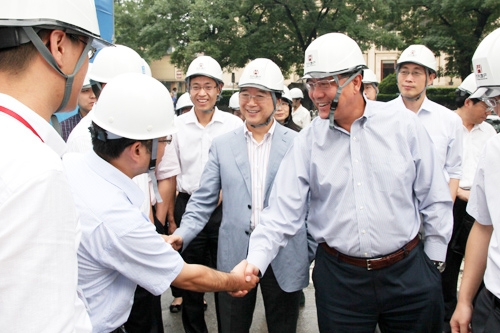 近日,中化集团副总裁韩根生赴中化集团在港上市企业方兴地产(中国)有限公司在京地产项目及下属公司,开展党的群众路线教育实践活动调研。 韩根生副总裁分别于8月31日和9月4日,在方兴地产北京亦庄项目示范区、金茂北京王府井万丽酒店项目(原王府井大饭店改造工程项目)作了现场考察,并与方兴北京部分基层员工座谈。 在王府井大饭店改造工程现场,韩总就改造施工中的难点问题,以及工程组织、安全施工、文明施工等问题,与现场人员进行了讨论。在中化方兴置业(北京)有限公司,韩总听取了公司教育实践活动及经营工作的汇报,并重点听取了公司基层员工对中化集团、方兴地产经营发展的意见建议。方兴地产董事长何操陪同调研。