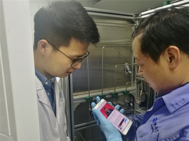 中化蓝天下属浙江省化工研究院的科研人员在科研间隙收看十九大开幕式直播