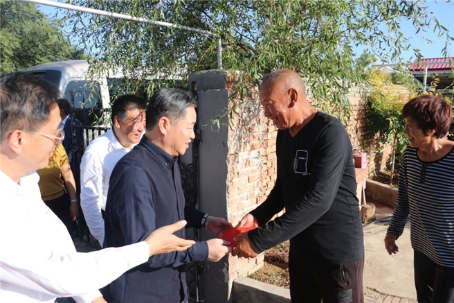 宁高宁看望慰问贫困家庭 随后,宁高宁来到十二吐村,走访慰问了两户建档立卡贫困家庭,送上了来自中化的关怀与问候。在得知十二吐村贫困户邹广学一家因病致贫时,宁高宁十分关心老人身体恢复状况以及目前当地医疗政策扶持情况。宁高宁鼓励他及家人增强信心,提升致富本领,早日摆脱贫困,过上美好生活。
