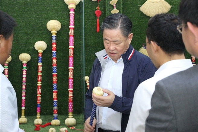 宁高宁考察中化帮扶的笤帚苗产业扶贫项目 结束在林西县的调研,宁高宁一行当晚赶赴阿旗。9月27日上午,宁高宁首先来到先锋乡调研2018年由中化招商引入技术并投资建成的种、研、产、销一体化笤帚苗加工产业扶贫项目,该项目主要发展旱作农业,笤帚苗种植规模超过6000亩,采用合作社+农户模式带动群众种植和务工。宁高宁在听取阿旗旗委常委、副旗长、中化扶贫干部吕海涛及先锋乡党委书记杨立铮的介绍后,步入笤帚苗产品加工车间,饶有兴致地了解具有浓郁民族特色的笤帚苗手工艺产品。宁高宁指出,笤帚苗是个很有发展的产业项目,在生产常规产品并获得市场认可后,应寻求机会引入时尚设计元素提升手工艺产品的附加价值。