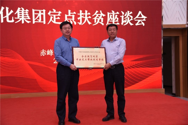 中化集团获内蒙古自治区“全区脱贫攻坚中央定点帮扶优秀单位”荣誉 9月27日下午,宁高宁一行与内蒙古自治区扶贫办、赤峰市及林西县、阿旗党委政府相关领导进行座谈。会议由赤峰市副市长汪国森主持,林西县委副书记、县长付守利和阿旗旗委副书记、旗长孟晓冰分别介绍了两地经济社会发展、脱贫攻坚工作及中化定点扶贫工作开展情况。内蒙古自治区扶贫办副主任赵辉对中化集团近年在定点扶贫工作领域取得的突出成效给予高度评价并表示衷心感谢,希望中化集团在脱贫攻坚决胜阶段对赤峰市两地继续予以大力支持,确保脱贫攻坚任务全面胜利完成。会上,自治区扶贫办为中化集团颁发了“全区脱贫攻坚中央定点帮扶优秀单位”奖牌。